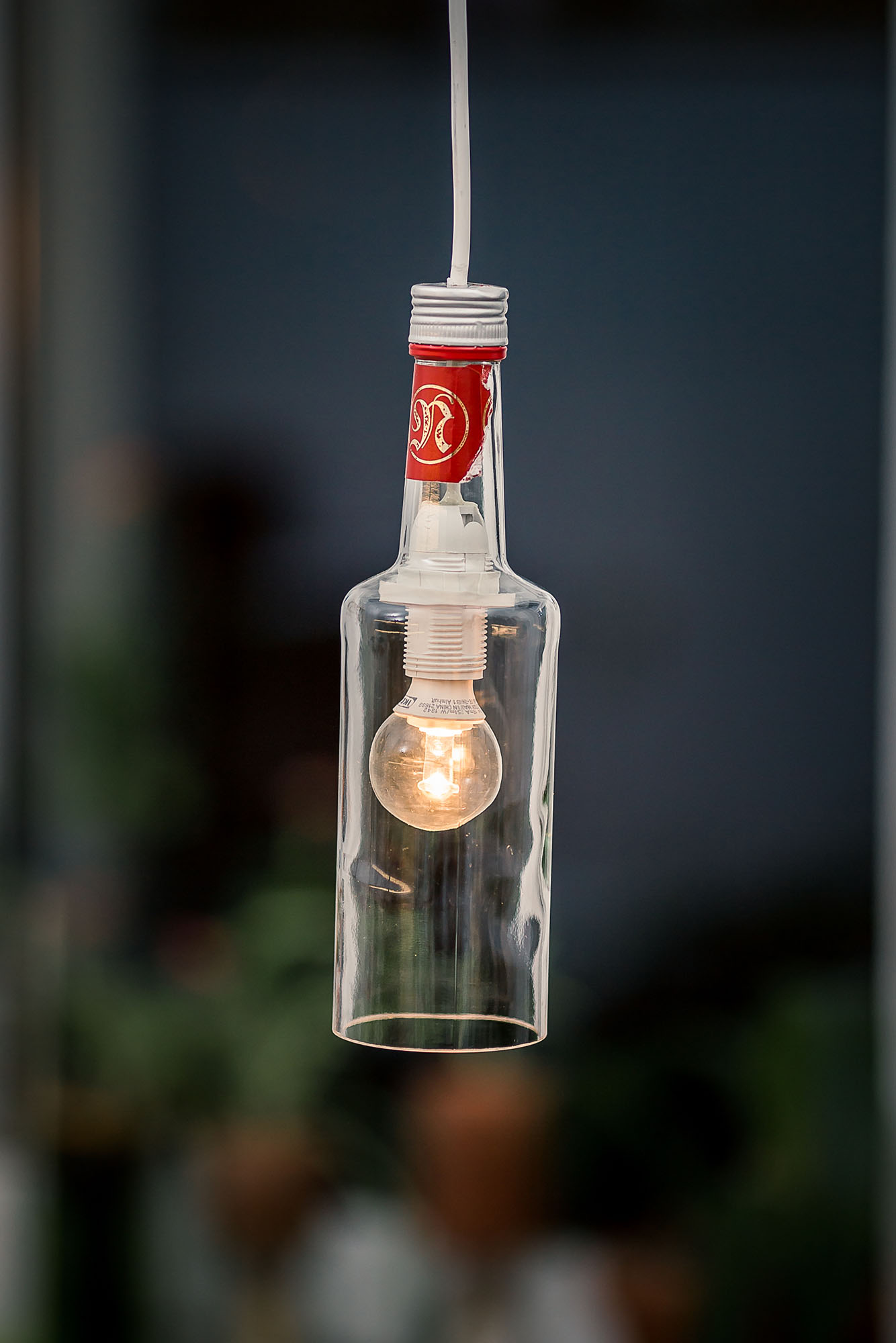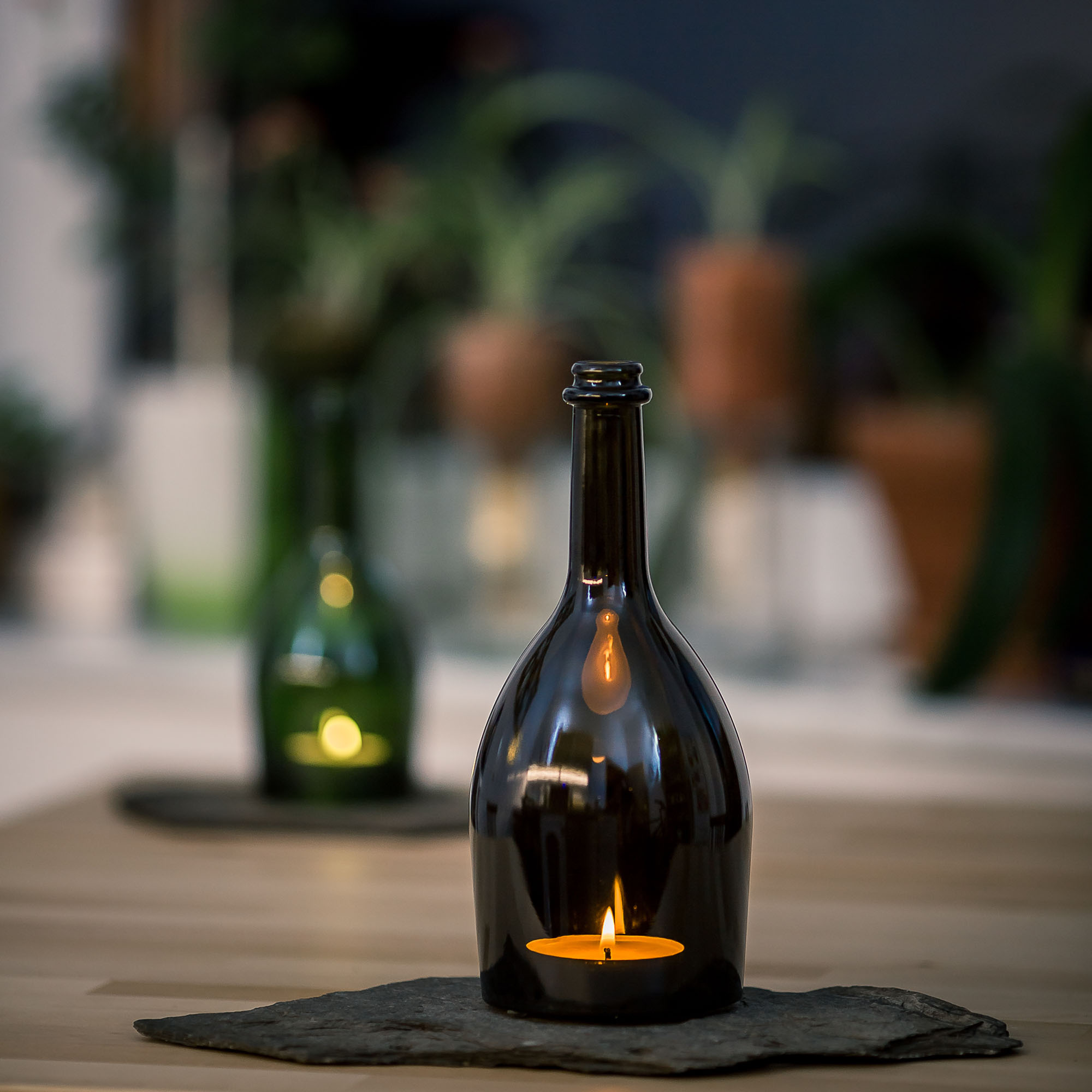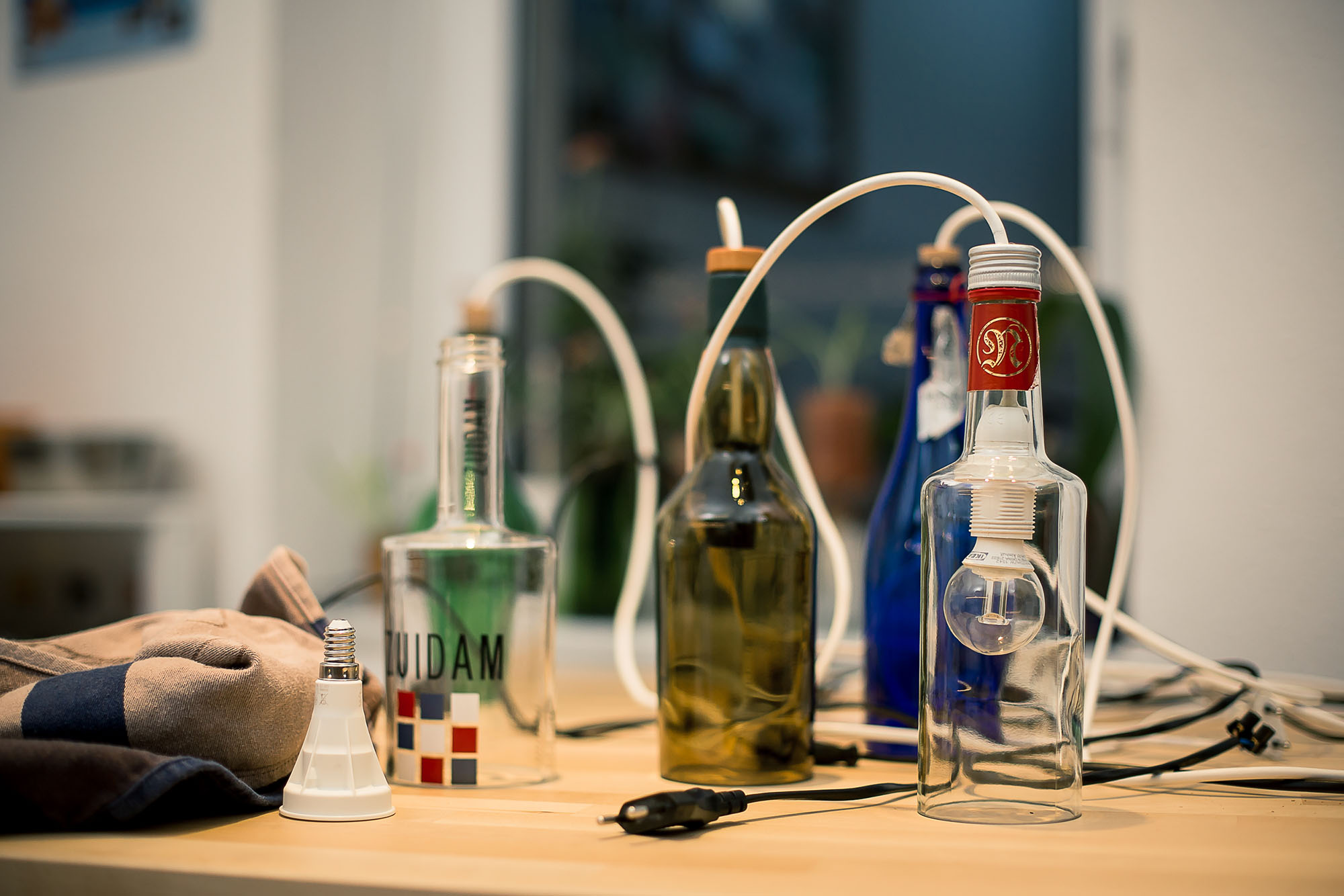 Mit anderen Worten Micha und Lars reinkarnieren hauptsächlich alte Flaschen und zaubern daraus tolle Gläser, Lampen und Accessoires.